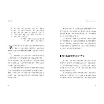因此,各位在看這本書的時候,切莫當成教科書或工具書來苦讀,彷彿回到學校準備考試一樣。兩位作者所提倡的創業精神、主動意識、務實樂觀的人生態度——大膽做夢、認清現實、勇敢去闖,都是我們能從書裡學到的寶貴人生態度。