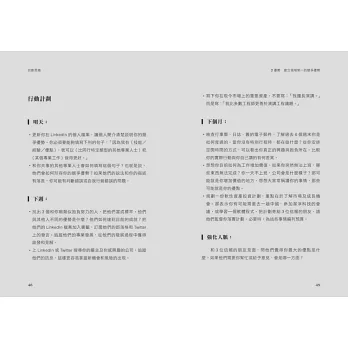 全書從「人人都是創業家」開始,逐步討論如何創造個人軟性資產,為自己帶來職場上的優勢。再談ABZ 職涯發展計劃與人脈經營,並對機會和風險進行分析,提供了非常清楚的脈絡。更棒的是,書中每個章節都提供了「行動計劃」,讓讀者可以實踐書中提到的重要觀念。
