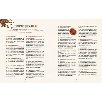 2.貼心企劃「任意門」和「懶人包」單元。不想依目錄循序閱讀,可隨「任意門」跳到相關議題頁面;「懶人包」直接告訴讀者本段重點精華,並規劃手沖咖啡常見問題Q & A,解決所有手沖咖啡會碰到的問題。