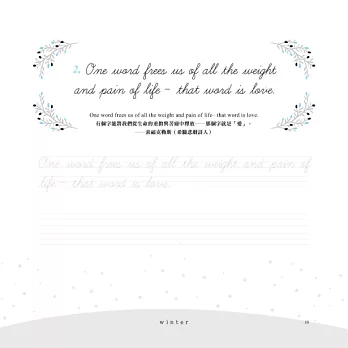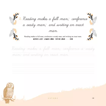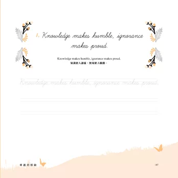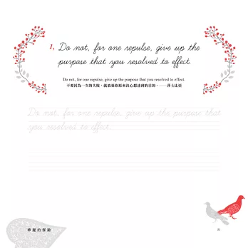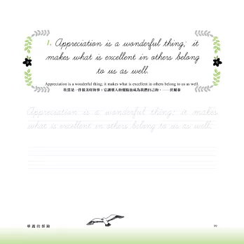 ◎Step 1:先別急著下筆,細讀英語格言領略經典智慧,同時可對照中文翻譯。也可以比較看看,同頁並列的英文草體與正體的變化。