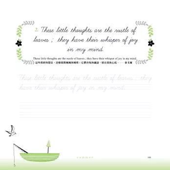 ◎Step 3:接下來,你可以運用頁面下方無虚線的空間展現書寫。隨著筆觸益發流暢,每一筆小彎曲或小上揚,都將帶動你的心情飛翔。