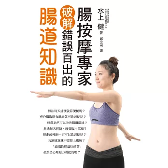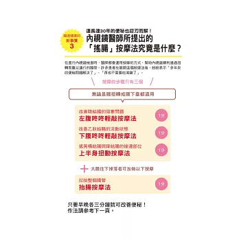世界內視鏡醫師權威-水上健醫師,觀察過2萬人的腸道後所發現的秘密,教您透過自我檢測,探索腸管形狀,若有「腸下垂」、「腸扭轉」的問題,也不用擔心,獨家傳授「搖腸按摩法」,免開刀、免吃藥!解決便祕、腸道不適,強化腸道機能、維持腸道健康,直到100歲!