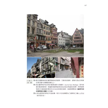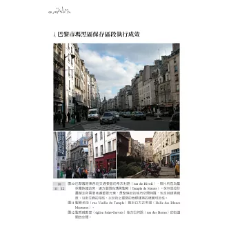 擁有法國建築師文憑的王維周,在書中以巴黎市瑪黑區(第三、四區)、第七區,以及盧昂市、布羅瓦城等舊城的保存區段為例,討論在城市開發之餘,法國在舊城街廓保存的實務操作,除了法令、制度的規劃,並搭配許多精彩的街城照片,不只讓法國舊城的美麗穿越了時空躍然紙上,也提供臺灣在保存建築文化資產的經驗參考。