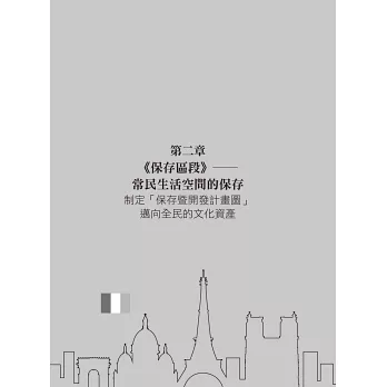 本書內容針對法國《保存區段》法令的執行有相當清楚的說明,吾人可藉由本書理解法國的文化資產保存,並非單純的浪漫想像,而是更有其策略與推動想法。我國的文化資產保存逐漸與世界的保存理念接軌,本書得以作為未來文化資產保存法系與實施內容的參考。-陳郁秀(前文建會主委 、白鷺鷥文教基金會董事長、 台法文化協會理事長)