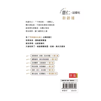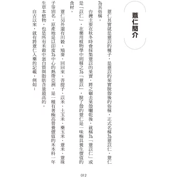 今天為大家推薦的這本書,除了介紹到薏仁的種類、營養、功效,也詳細解說了各種薏仁食療法。食療法並不講求快速的療效,而是必須持之以恆,透過體質的調整來達到改善身體狀態的效果。現代人生活忙碌,壓力又大,平時外食居多,長期累積下來,對身體多少都會造成傷害,透過適當的食療法,就可以將身體調整到一個較健康舒適的狀態。