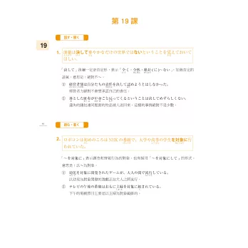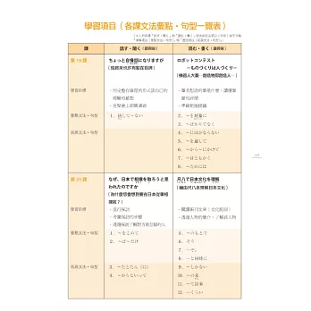 針對各課的學習目標,除了說明例句及表現帶領學習者理解重點文法,更進而引導學習者拓展練習,幫助釐清文法含義。並於單元末收錄「學習項目」,彙整出各課文法要點・句型一覽表。