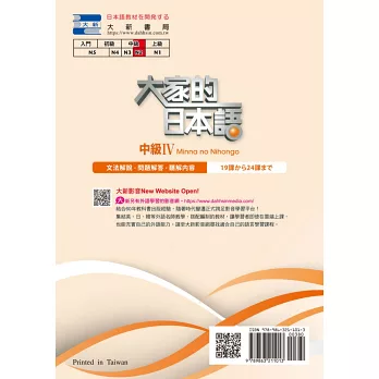 此書為《大家的日本語 中級Ⅳ》的文法解說・問題解答・聽解內容。