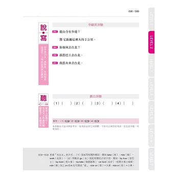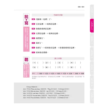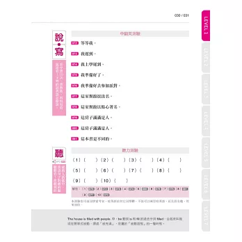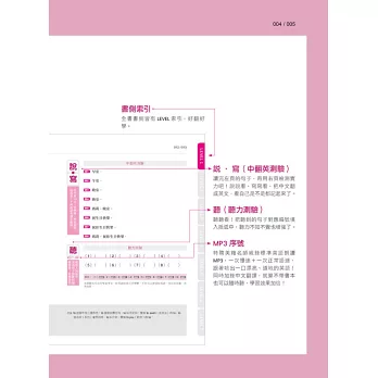 ★聽說讀寫最完整:精心規劃的版面,先聽+讀熟左頁句子,再練習右頁的「中翻英測驗」、「聽力測驗」,聽、說、讀、寫等四大核心能力,統統一起搞定!