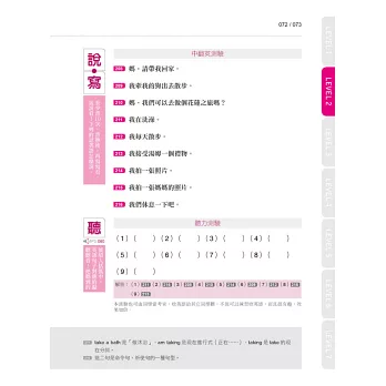 STEP 2. 讀熟左頁句子後,利用右頁檢測實力。「說‧寫(中翻英測驗)」,將看到的中文翻回英語,訓練口說與寫的能力。