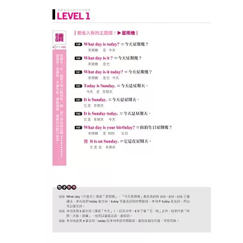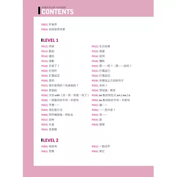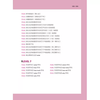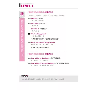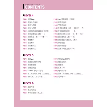 全書依難易度分成LEVEL 1~LEVEL 7,讓學習者可循序漸進、按部就班學習。每個LEVEL又以主題分類句子,除了有「打電話」、「星期幾」等日常生活主題,也有「現在完成式」、「副詞子句」……等文法主題,分類多樣又完備。若要針對不熟句子做複習,也可從目錄迅速查到主題頁碼,省時又便利!