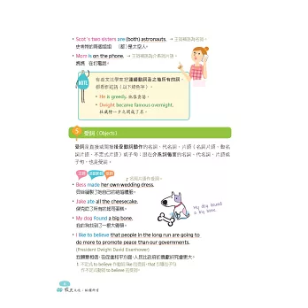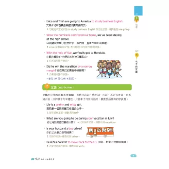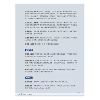 ★豐富有趣的例句:學文法不能只談規則不知運用,本書提供大量例句,內容包羅萬象,充滿想像力,有日常會話、知性例句、詩句,廣泛運用生活、故事、童詩、新聞、知識等題材,結合文法說明編寫例句,幫助熟悉更多領域的英文用語!