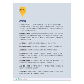 本書是坊間內容最齊全的文法書,而扎實的文法基礎,才是完美學習英文的王道!二版調整為22個大單元,囊括必備的完整英文文法,從初階文法到進階文法,從基本文法到高階用法,皆有詳細說明與指導,《英文文法全書》絕對是您書架上不可或缺的一本書!