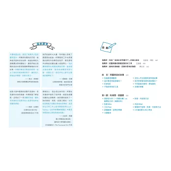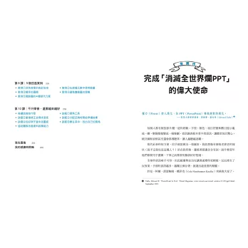 最後,她決定至各地教學及寫作,完成自己「消滅全世界爛PPT」的偉大使命。從這本書裡可以學到: