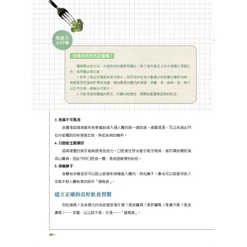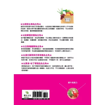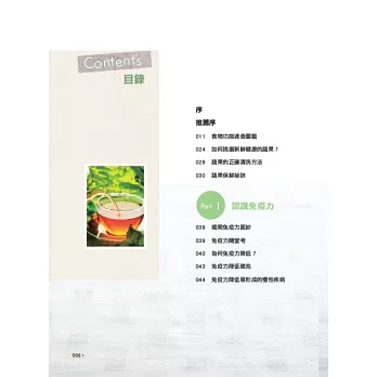 除了食物的搭配示範外,為了方便讀者選對食材、吃對食物,在本書的最前面,我們特別依提升免疫力、預防感冒、預防癌症、抗老化、預防便祕、抗壓力、避免失眠、預防慢性病、強健體質、抗焦慮與失眠、補血等需求,編製了「食物功能速查圖鑑」,讓讀者能迅速找到所需要的食材。