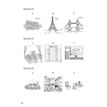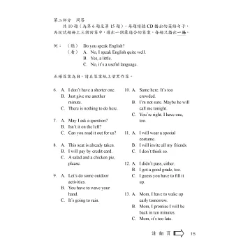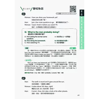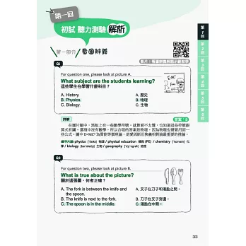 本書的每個題目都有詳盡的分析,讓你知道什麼樣的題目該注意什麼樣的重點,例如:寫聽力測驗的看圖辯義時,要注意圖片是否有人物?是否能判斷出地點在哪裡?人物有什麼動作?如此一來在音檔還沒播放前,就能先預測題目會考什麼,同時教你要用什麼樣的解法去解題。本書每題的解析,絕對不僅是單純的把題目英翻中、給答案就交代過去的解析,而是非常詳盡的講到你真正懂為止。經過本書六回的訓練,正式考試時選對答案將只是你的「反射動作」。