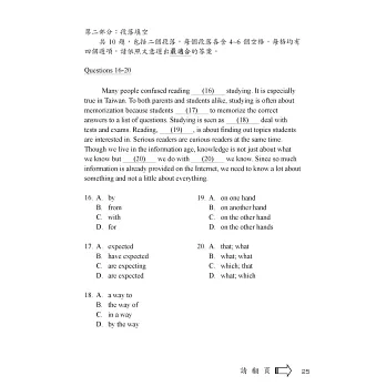 閱讀測驗一開始的第1~15題,題目不長,應以平均一題約30~40秒的時間解題,若一道題目還得花一分鐘以上的時間,下場就是交卷前5分鐘才開始要看3~4篇的長文章、解10道題,題目當然寫不完。