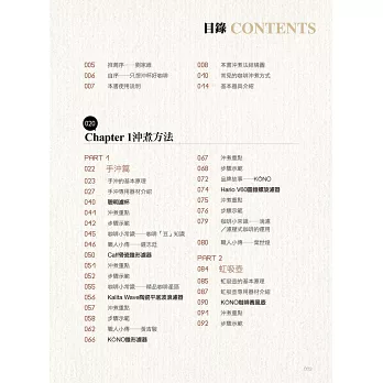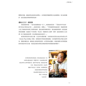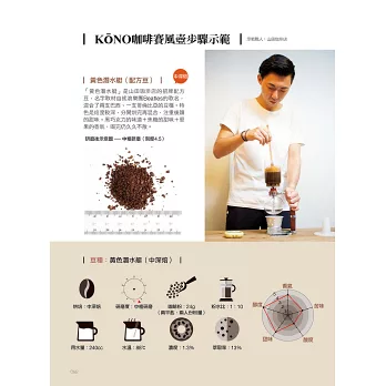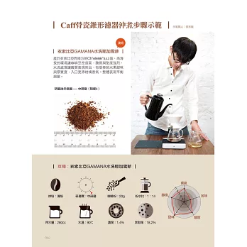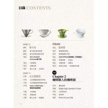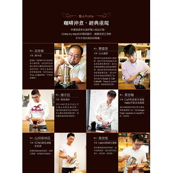 書中「職人小傳」、「咖啡職人的咖啡館」,分享咖啡師接觸咖啡與開店經營的心得,不論是剛開始接觸咖啡的新人,或更加精進沖煮技巧,本書將會是你唯一選擇!
