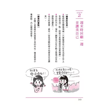 步驟1每天一定要讚美自己。從生活、工作、外表,以往視為理所當然的事,讓大腦習慣讚美的指令,養成讚美的習慣。