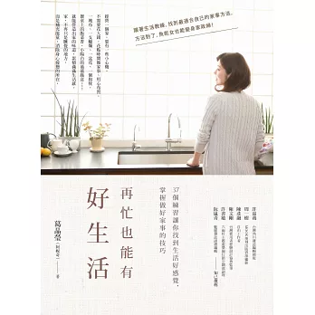 在這本書中,YAHOO!奇摩第一屆生活摩人、MY LOHAS園藝單元及台北畫刊「家事全通略」專欄作者阿妮奇(Annie K.),針對生活中最基本而切身的項目,如料理、園藝、收納、家事(洗衣、打掃、廢物利用等),以一貫溫潤流暢的筆觸,分享自身的經驗和故事,引進歐美生活教練的概念,利用表格、清單、小測驗和方便好用的便利貼,搭配豐富的實境圖片,設計了37個簡單的實作練習,規劃執行細節與步驟,提供具體實用且多元的生活方法,讓每個人都能憑藉自己的環境與經驗,從點到面,透過自我練習,找到生活好感覺,讓生活更有品質,也讓家更有歸屬感。
