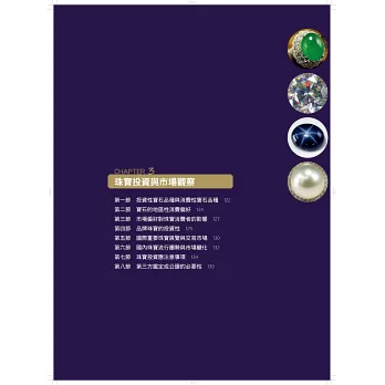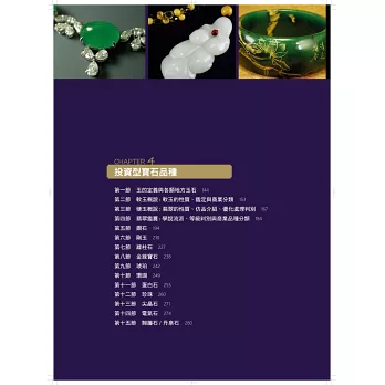 寶石賞析知識則是分為貴重寶石、玉石、有色寶石、印石等幾個部分。不同的寶石具有不同的特性與賞析標準,除非讀者能夠掌握這些標準,否則要對為數眾多的幾百種寶石做優劣評鑑實屬不易。