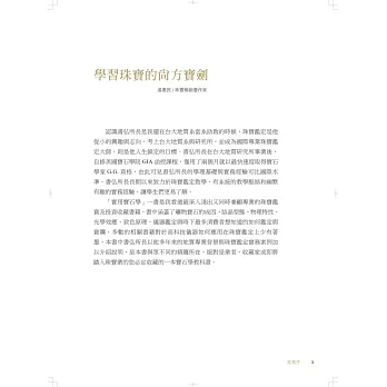有鑑於國內的珠寶專業書籍雖多,但較少有系統的寶石學專書,因此筆者匯集珠寶鑑定、賞析、收藏與估價等各方面的專業知識,以更淺顯易懂的方式表達,不僅降低學習寶石知識的入門難度,也兼具珠寶鑑定實務,期許初學者經由此書能獲得豐富的寶石知識,更希望已有珠寶背景的進階讀者能再有所收穫。