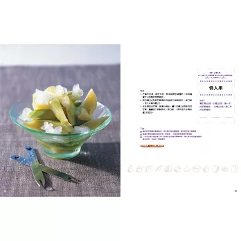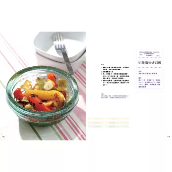 ◆全書依難易度分為〈簡單好做醃漬篇〉、〈靈活應用醃漬篇〉,可從簡單款入手,進而挑戰進階版,菜色選擇變化多。