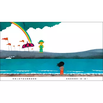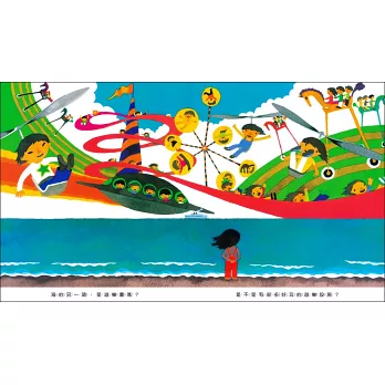 小女孩看著大海,對未知世界的想像包含了興奮、不安、害怕和期待……最後,小女孩說:「好想到海的另一頭去看看喔!」