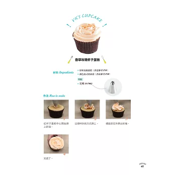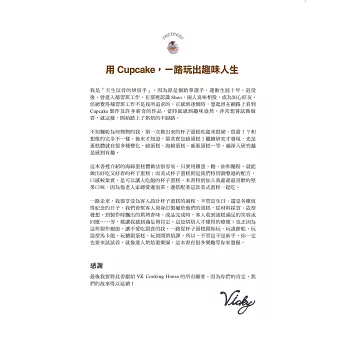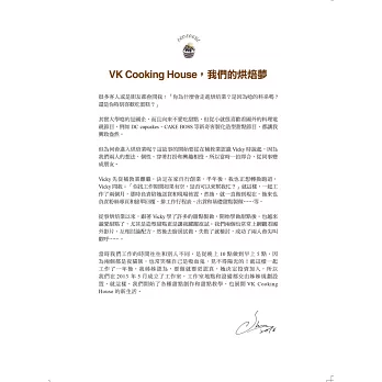 從每種材料的選用處理,到步驟的各樣細節,溫度溼度的控制…,每一個環節都影響著成敗。VK Cooking House完整分享多年累積下來的實戰經驗,從簡單入手的美式杯子蛋糕到充滿想像力的糖霜、造型小蛋糕,沒有過多的矯飾,自然、用心做出來的甜點,單純而美好。