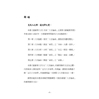 《看圖八字》是「五行八字命學」的入門書,內容以看圖實作為主簡要易學,八字論命基礎知識非常容易上手。《看圖八字》以上一著作《八字基本功》為基本架構,按圖講述「八字論命」的實例操作。讀者可以用自己的出生時間做練習,推論自己生命的變化,了解更內心的自己,實作非常簡單有趣。