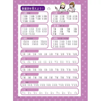 同時針對台灣人特別弱的「數詞」詳細地列表說明,例如: