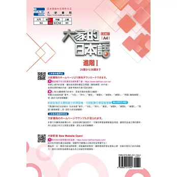 《大家的日本語 進階Ⅰ 改訂版 A4》、《文法解說・參考詞彙・課文中譯》等多樣輔助教材(將陸續出版),更可搭配智慧筆,隨時點讀學習。無論是課堂學習、課餘複習,或是在家自學,學習者可選擇最適合自己的學習方式。