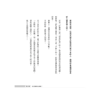 如果你想過著不用為錢煩惱的人生,這本書絕對就是你的救命寶典!像是「錢不夠用,一天到晚都要為錢傷腦筋」、或「如果有錢,我就可以過更好的日子了」、或「為什麼我必須過這種窮苦生活!」、還是「我恨死那些有錢人了」、甚至是「真羨慕那些不用努力就能輕鬆賺大錢的人,老天爺真是太不公平了」等等......。