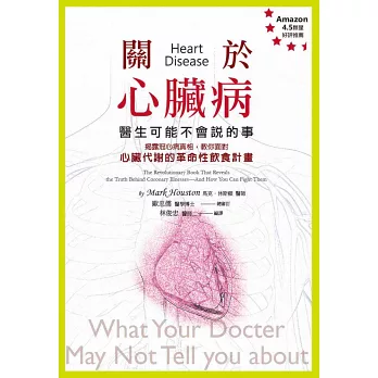 •如果你有心臟疾病問題,快讀這本書!馬克.休斯頓博士的開創性著作,一本治療和預防心臟疾病的實用工具集。──美國自然醫學的領袖人物 馬克.海曼醫師(Mark Hyman,MD)