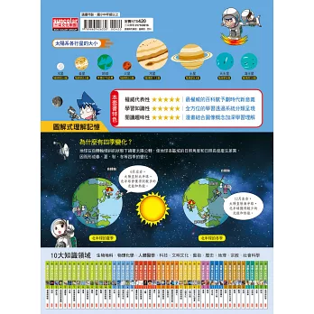 〈宇宙〉一書中可以發現有些特色能分享給讀者:包括書中圖片精確美觀、對話式漫畫引導生動有趣、提供的科學知識點非常實用清楚,對於小學生提升多元化知識是非常受用的,尤其在這3C螢幕時代,對小學生而言,具有實際觸感的紙本讀物更顯珍貴,因此,《漫畫大英百科》套書確實很值得為您推薦。──桃園縣壽山高中歷史科教師‧王偲宇