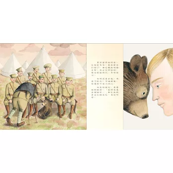 這段真實故事在蘇菲‧布雷克爾抒情細緻的彩筆下,幻化為兼具歷史意義與情感深度的紙上劇場。看哈利與許許多多年輕的士兵們搭上火車準備遠征,與家人們揮別的場景,讀者們都能感受到戰爭如何無情的改變了整個世界與眾多家庭的命運;當哈利下定決心把維尼送到倫敦動物園時,畫家繪出哈利握著維尼的手,彼此依依不捨的模樣。蘇菲‧布雷克爾為了繪製本書的插畫,對故事描繪的時代背景與船艦、衣飾等細節,都做了詳實的考據調查。她用輕快又親暱的清新詮釋,活靈活現的畫出維尼活潑可愛的神情。士兵一個接一個排隊為維尼送食物的場景真是太好玩了──看啊,有人捧著一大堆紅蘿蔔,有人抱著一簍番茄,為維尼送上好吃的食物;而維尼坐臥在哈利腿上,半瞇著眼睛用腳捧著奶瓶吸吮的樣子,任誰看了都會忍不住露出微笑。