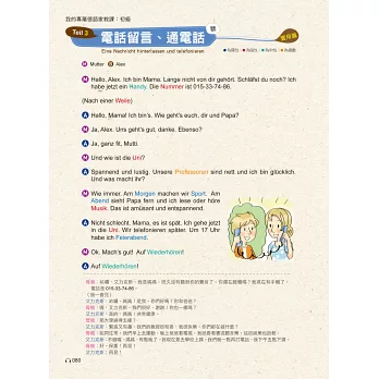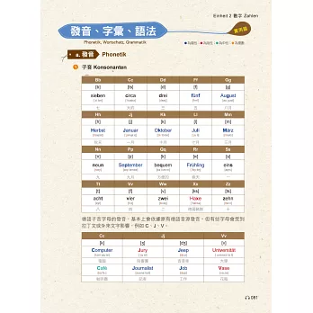 3,朗讀CD:「自修課本」中之基礎字母A-Z、變母音及德語單字、會話均由專業德籍老師親自錄音,從標準發音開始切入德語學習,事半功倍。
