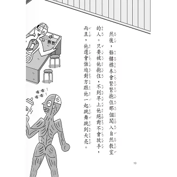 自然教室的骷髏標本是不是晚上就會起來跳舞?啊!好可怕呀!如果我晚上去的話,骷髏標本一定會抓住我不放!但如果被校長發現一個人晚上跑去自然教室,一定會被罵到臭頭的!啊!那比骷髏標本還可怕啊!如果在課堂進行中跑出去,可能會遇上傳說中的「分身校長」,那就不好了,所以只要......。原來只要不做某些事情,就不會在學校遇到妖怪,大家都記清楚了嗎?