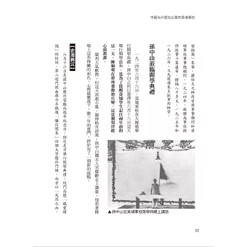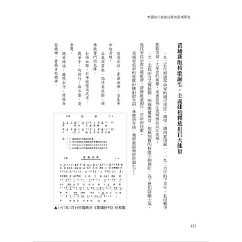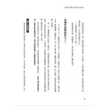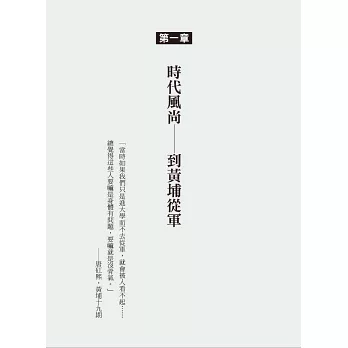 此後國民黨總理孫中山、校長蔣介石、黨代表廖仲愷、政治部主任周恩來、學生隊長金佛莊等,這些黃埔的靈魂人物一一登場,既不教條,也不生吞活剝的塞材料給讀者,而是夾敘夾議的書寫,主體文用細明體排印,為讓讀者進一步明白事情的背景,其中特地穿插「史海鉤沉」和「相關連結」,這兩部分則是用標楷體排印,相互對照,非常清晰,讀者不知不覺的就進入了1920、1930年代的時光墜道中。