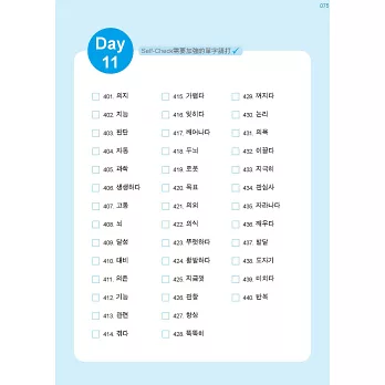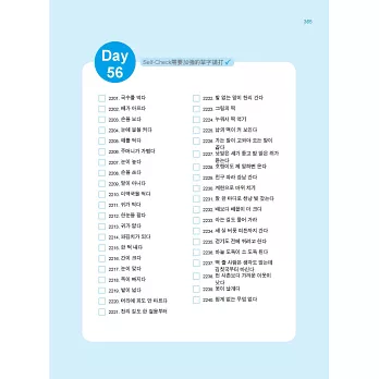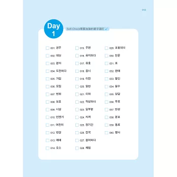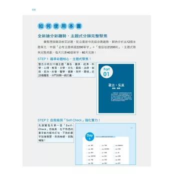 ●「Self-Check」自檢表:先瀏覽每天第一頁「Self-Check」自檢表,在不熟悉的單字前方框中打勾,不熟的單字加強複習,有效運用考前寶貴時間!