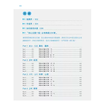 ●Part1「核心主題11個/必考精選2200單」:系統分類再聚焦,整合分析出11個主題含必背200個單字,囊括「廣告、圖表、經濟、科學、心理、教育、文學、文化、藝術、法律、制度、政治、社會、醫學、健康、自然、環境」近20個層面,分門別類一網打盡。