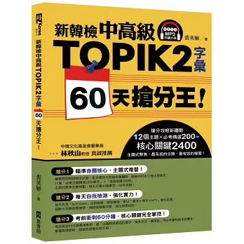 彙整歷屆韓語檢定試題,配合最新中高級命題趨勢,歸納分析出12個主題單元:11個「必考主題精選2200單字」+「俚語俗諺200則」。主題式聚焦完整規劃,每天只要40個單字,60天完勝!