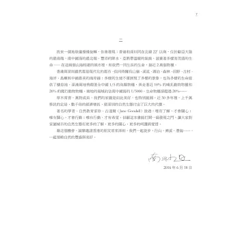 著名的學者、自然教育家珍.古道爾(Jane Goodall)說過:唯有了解,才會關心;唯有關心,才會行動;唯有行動,才有希望。但願這本書能打開一扇發現之門,讓大家對家園城市的自然生態有更多的了解,更多的關心,更多的呵護與愛惜。
