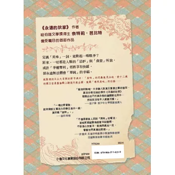 讀完《尋找美味》,您可能會發現作者芭比特的文字描繪細膩,意象鮮明。但您可能不知道她在成為作家之前,已經是知名的插畫家了。這本書雖是芭比特的處女作,卻可清楚看出其作品的兩大特色:一是童話故事的元素,如美人魚,小矮人,樹精,風等等;二是她善於利用文字的多重意涵,寫出美麗、有趣、意味深長的故事。本書中每一個人物乃至於動物的名字,都是芭比特根據角色的身分、特質、個性刻意挑選的字,字義還可以延展引申,完全無法直譯,只能音譯。作者的創意流失於譯文,從來都是譯者的無奈,也是讀者的無奈。