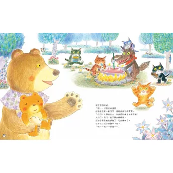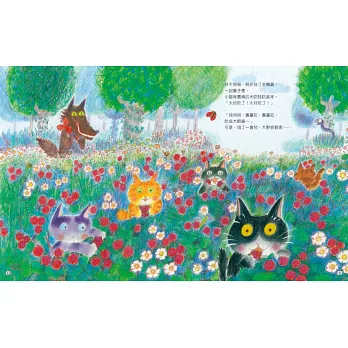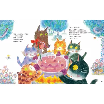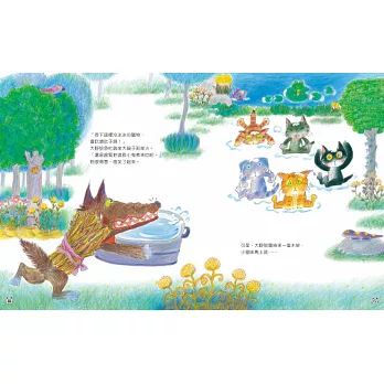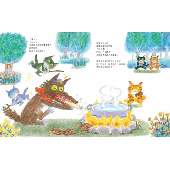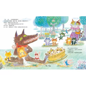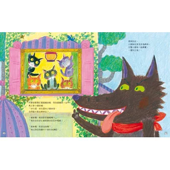 2.全書畫風溫馨甜美,色彩鮮麗的插畫、細膩的構圖,特別是幾隻小貓咪可愛動人的神態,天真無邪,對比大野狼邪惡狼狽的模樣,讀來讓人會心一笑,愉悅開懷。