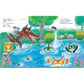 可是一路上並不順利……來到森林的小貓咪完全不聽使喚,猶如一群可愛的小頑童,一會兒採木莓吃,一會兒玩泥巴大仗,弄得全身髒兮兮,接著又噗通、噗通跳進池塘裡……大野狼為了尋找更講究、更美味的吃法,被這群天真的小貓咪搞得團團轉,狼狽不堪又哭笑不得。