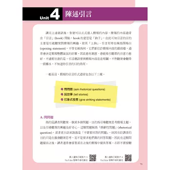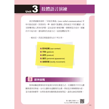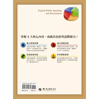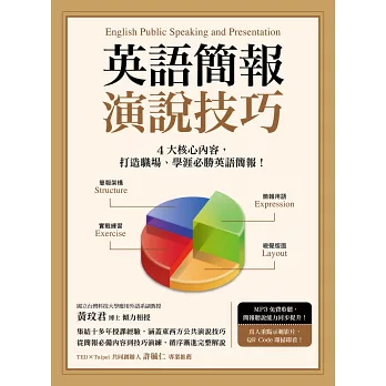 本書首度公開連續15年最受歡迎的英語簡報課程菁華,包括西方英語演說技巧,從簡報必備內容到技巧演練,循序漸進完整解說。在重點學習篇章,另搭配十多支影音示範影片,讀者只要掃描書中QR Code,即可看到講者的手勢、臉部表情,學習效果更佳。書中提供大量練習題及「延伸學習」專欄,方便讀者即學活用。不但適合非英語母語者自學,更是大專院校的英語簡報、演說課程的最佳教材。