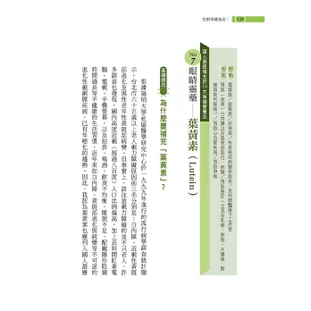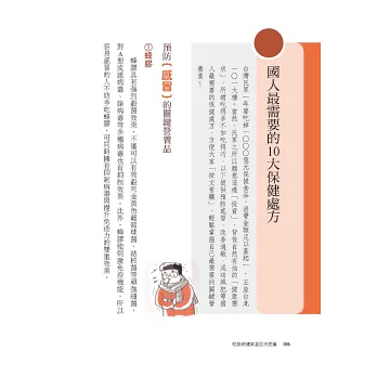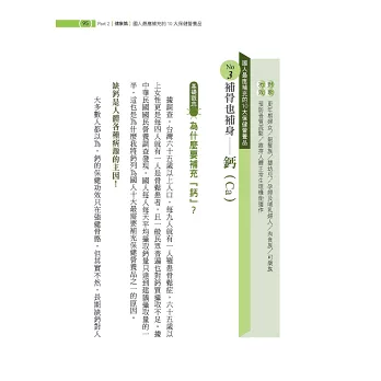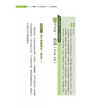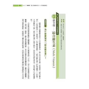 ■為國人篩選出最應補充的10大營養素:你知道「常喝碳酸飲料與常吃肉的人,鈣質容易流失」、「三餐老是在外的老外,最需要補充綜合維他命」嗎?本書針對國人的生活、飲食習慣及各族群的健康需求,嚴選 10種國人最應補充的營養素,方便讀者快速掌握自己需要。