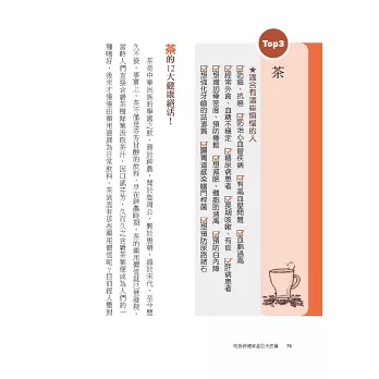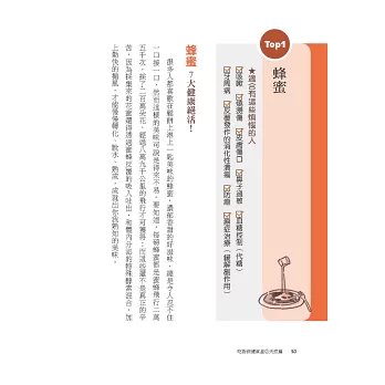 ●10個小問題,3分鐘測出天然保健食品觀念:你知道「燕窩的烹煮溫度不可超過80℃」、「冷泡茶的茶多酚含量比熱茶少」、「符合CNS 1305 蜂蜜國家標準,不見得就是100%純蜂蜜」嗎?本書提供10個天然保健食品小問題,3分鐘就能知道你是不是真的都吃對!選對!