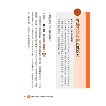 ●專屬外食族、3C電腦族、素食族的保健處方:你知道嗎?「外食族」可補充益生菌+藍藻,打造良好腸胃環境;「3C電腦族」可補充葉黃素+魚油+薑黃來保護眼睛,同時緩解肩頸肌肉痠痛的問題;「素食族」可補充綜合維生素+鈣和維生素D,來補足缺乏的營養?本書一次滿足不同族群對健康的期待與需求。