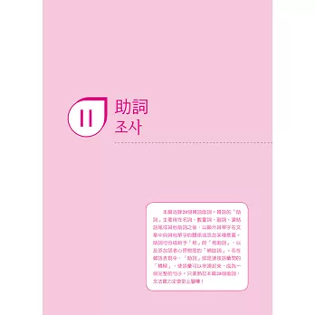 此篇收錄28個韓語助詞。韓語的「助詞」主要用在名詞、數量詞、副詞、連結語尾或其他助詞之後,而在韓語表現中,「助詞」即是連接語彙間的「橋樑」,使語彙可以串連起來,成為一個完整的句子。只要熟記本篇28個助詞,文法實力定更上層樓!